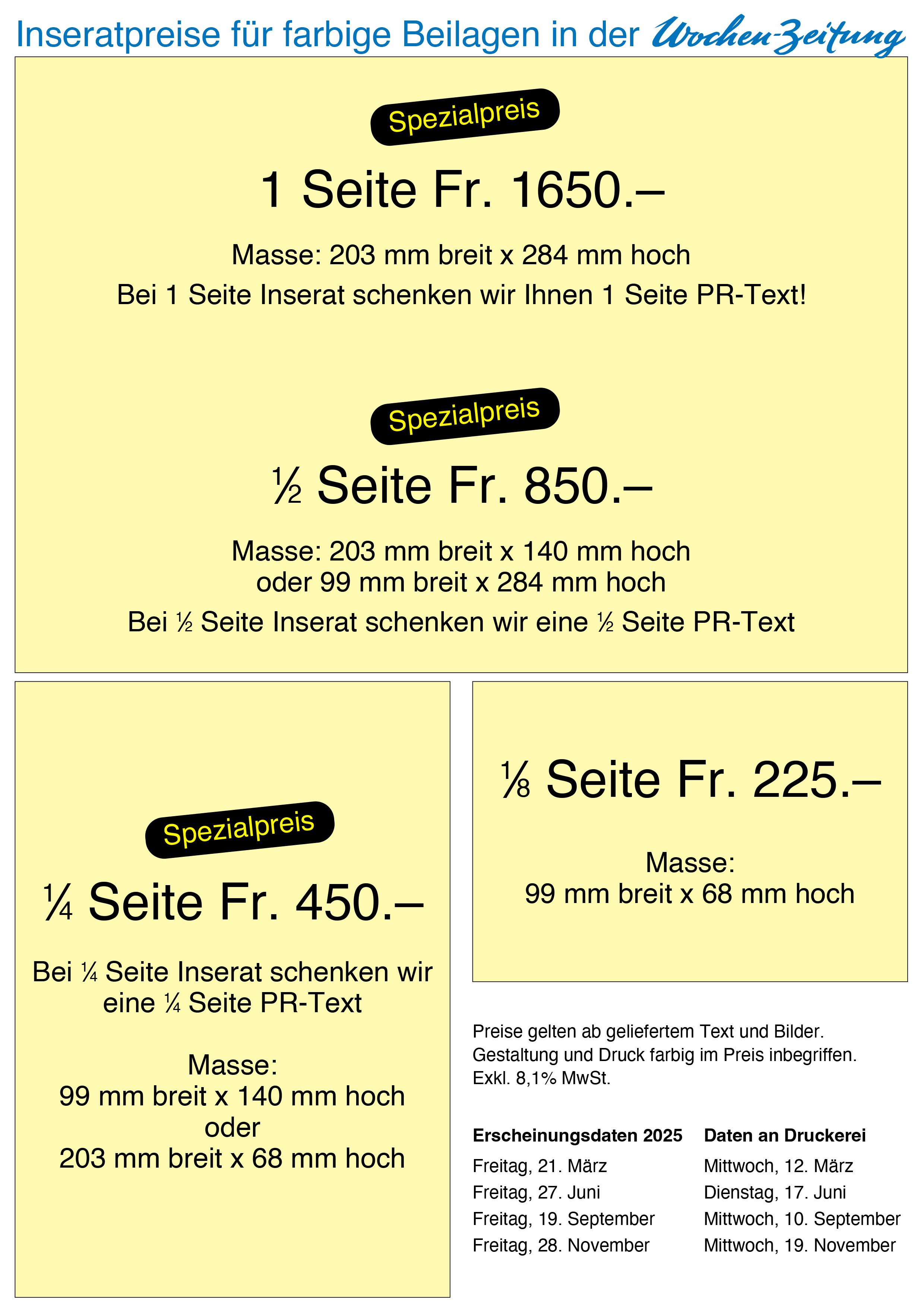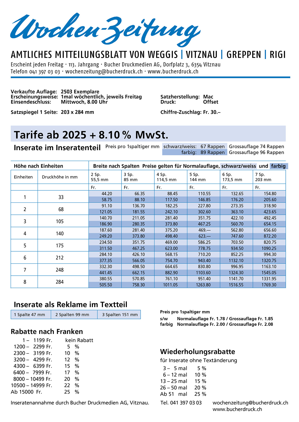 Die Wochen-Zeitung ist eine unabhängige Zeitung, welche einmal pro Woche am Freitag erscheint. Neben den Abonnenten in den Seegemeinden hat sie auch Leser in der ganzen Schweiz und wird sogar über die Landesgrenze hinaus bis in andere Kontinente zugestellt. Wir berichten über aktuelle Ereignisse, Politisches aus den Gemeinden, kulturelle Veranstaltungen und aktuelle Vereinsaktivitäten aus den Gemeinden Weggis, Vitznau, Greppen, Rigi und Gersau. Mit einer Auflage von 2500 Exemplaren sind wir eine ideale Plattform für diverse Geschäfts-, Veranstaltungs- und Wohnungsinserate sowie Publireportagen. Mehrmals im Jahr erscheinen Gross-/Sonderbeilagen in der Wochen-Zeitung, welche an alle Haushalte der Seegemeinden zugestellt wird.